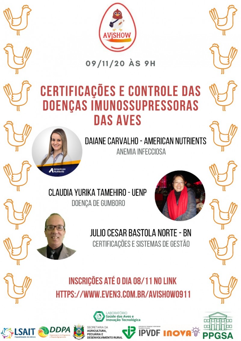 "Certificações e controle de doenças imunossupressoras das aves” será debatido no próximo dia 09/11, às 9h, em evento online Avishow, gratuito, organizado pelos pesquisadores do Laboratório Saúde das Aves e Inovação Tecnológica (LSAIT) do Instituto de Pesquisas Veterinárias Desidério Finamor. O LSAIT é vinculado ao Departamento de Diagnóstico e Pesquisa Agropecuária (DDPA) da Secretaria da Agricultura, Pecuária e Desenvolvimento Rural do Rio Grande do Sul.